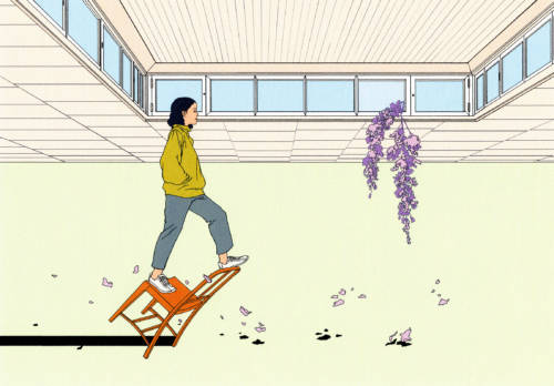 Manshen Lo draws using an ink brush before colouring her artworks digitally. She has a clarity of line and composition influenced by both cinematography and comics. Her subjects are approached in a naturalistic and minimal style, and are set in interior or exterior surroundings that create a tension and dialogue.